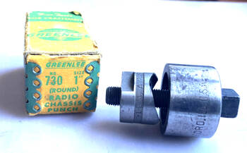 Greenlee hålstans, rund, 1 tum. För montage av rörhållare i plåtchassi. Föga begagnad och i originalkartong från ca 1965.